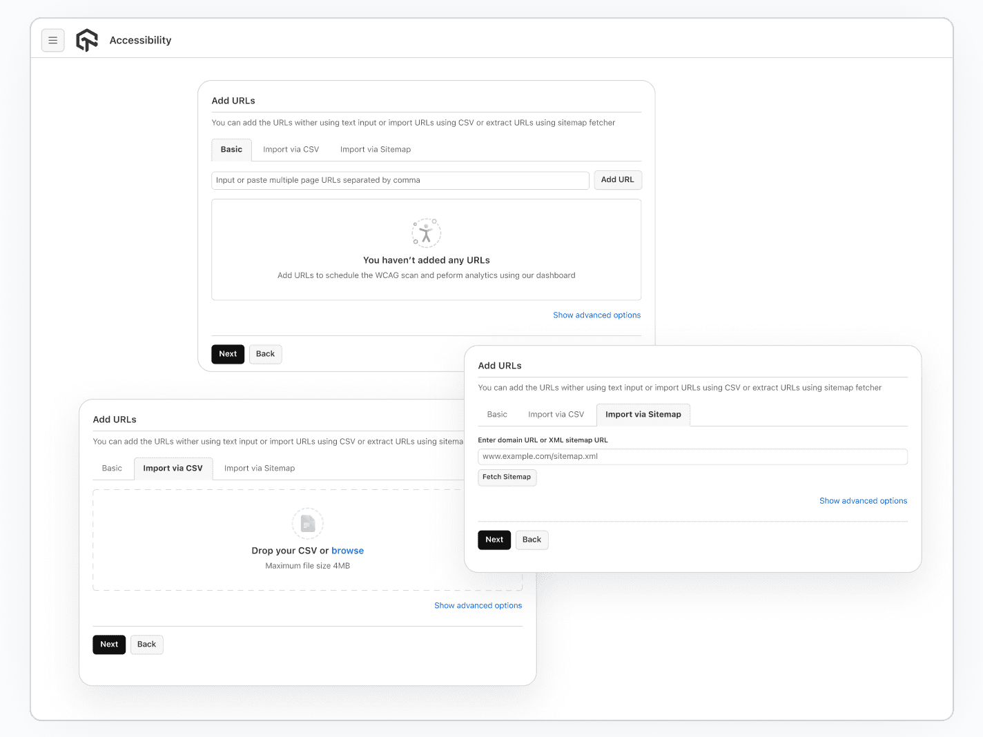 Easily test any URL for accessibility by importing it into the Accessibility Scheduler. Add URLs manually or upload them via CSV file or sitemap.