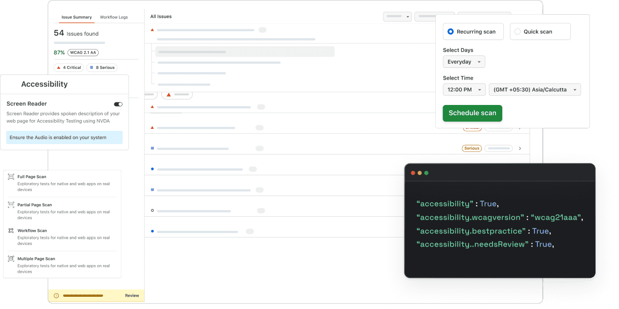 Full-page, partial, and multi-step accessibility scans with built-in fix suggestions.