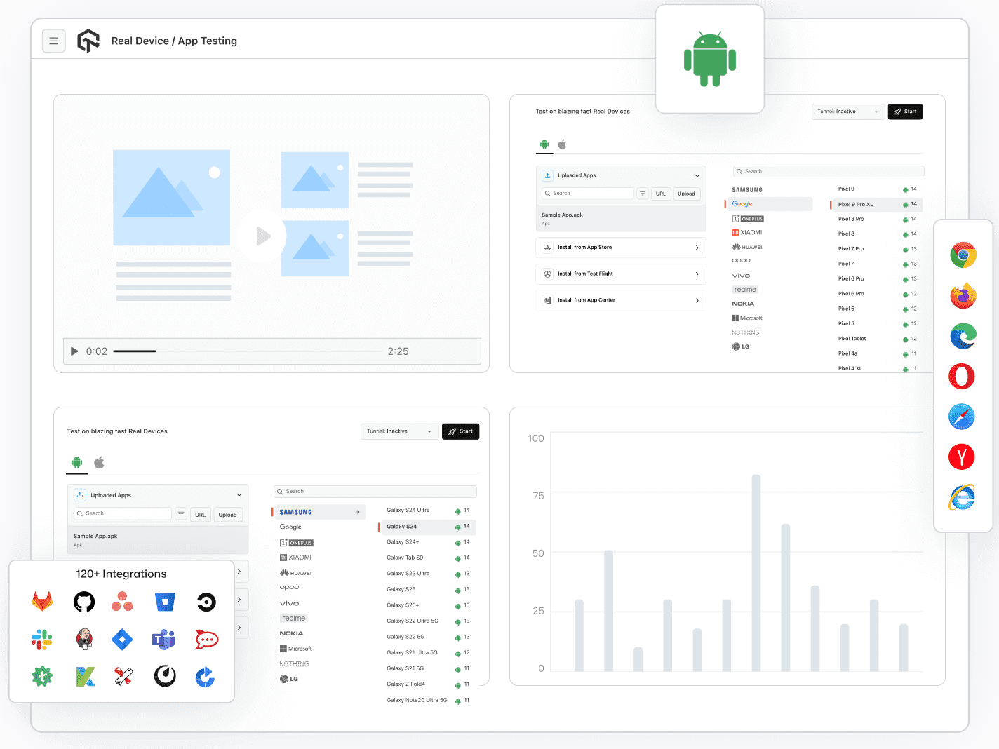 Test on android mobile devices using automation. Speed up app and browser testing with parallel execution on our Appium Grid etc. Make sure user experiences are flawless and effectively push innovation.