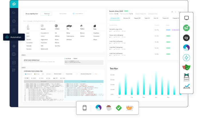 Test early, debug accurately, and release rapidly across 3000+ different browsers, browser versions, and operating systems.