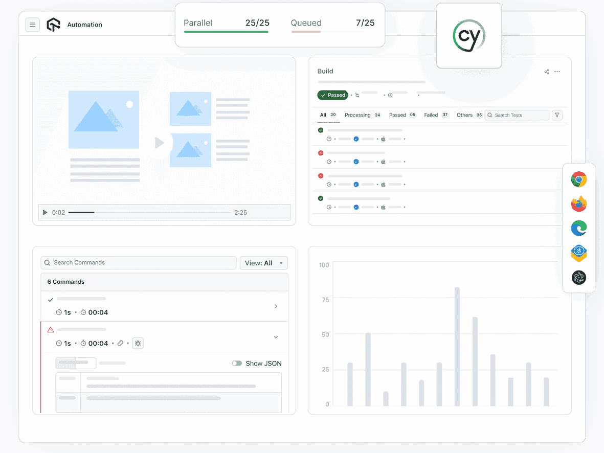 Execute and analyse Cypress tests in parallel. Expand browser testing coverage on 40+ browser versions and deploy quality builds faster with the TestMu AI cloud.