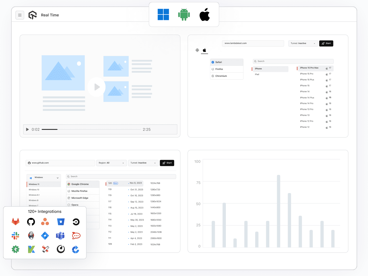 Debug your web, mobile, and hybrid apps in real time using device logs, network logs, app logs, screenshots, and videos. Examine UI anomalies on the fly with Appium Inspector and DevTools.