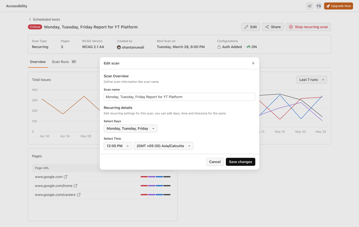 The Edit Report feature in Accessibility Scheduling allows you to modify scan settings for your scheduled accessibility tests. This document provides a step-by-step guide to update the scan name, recurrence details, and time for accessibility reports.