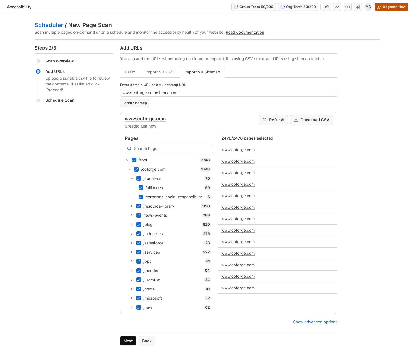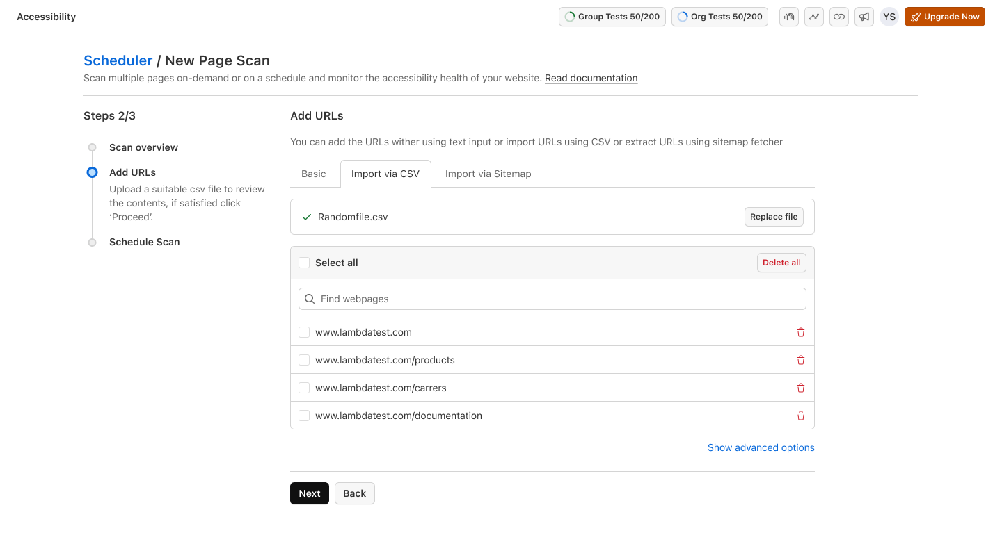 - Upload URLs via CSV