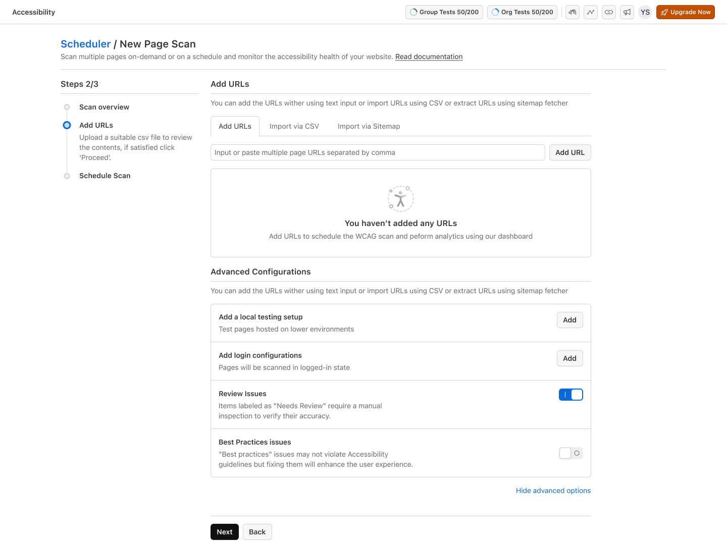 - Local Testing Setup (Tunnel) : If scanning locally hosted URLs, add a Local Testing Setup/Tunnel to access non-public environments. Upcoming