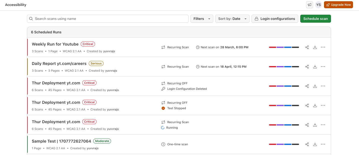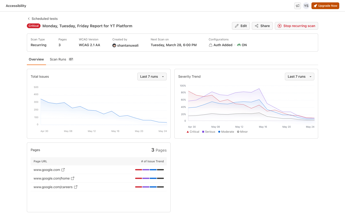 You can drill down into individual page URLs to view the number of issues found on that specific page using filters provided. From the scan report page, you can also edit, share and stop recurring scan if its no longer required.