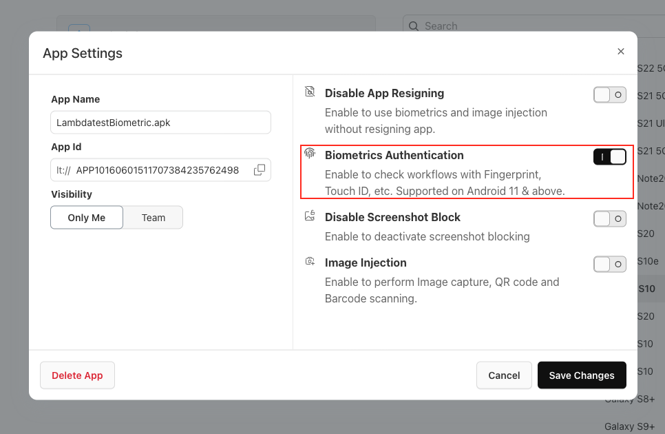 Step 3: Now, hover over your app and click on the Settings icon. Toggle the Biometric Authentication option and click on Save Changes button. Click on Start to run your app on the selected device.