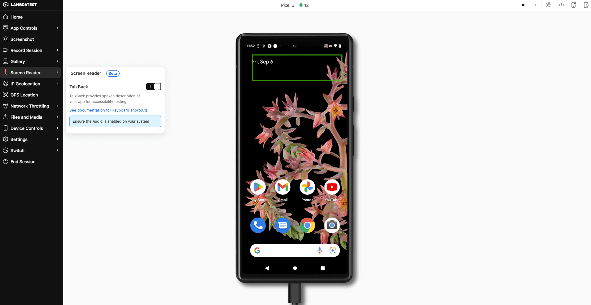 TestMu AI's Live Screen Reader feature empowers you to perform manual accessibility testing on real Android devices, allowing you to navigate through app elements with spoken descriptions of the UI—similar to the Google TalkBack functionality. This feature enables comprehensive accessibility testing to ensure compliance with WCAG standards.