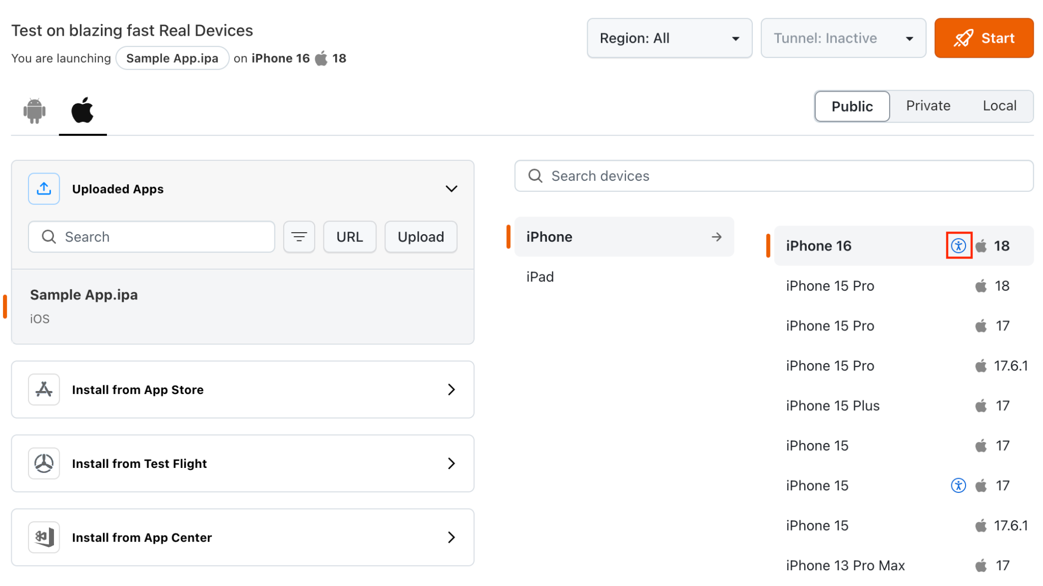 Step 2: Select a supported iOS device from the list. Supported devices will have an Accessibility icon next to them as shown below.