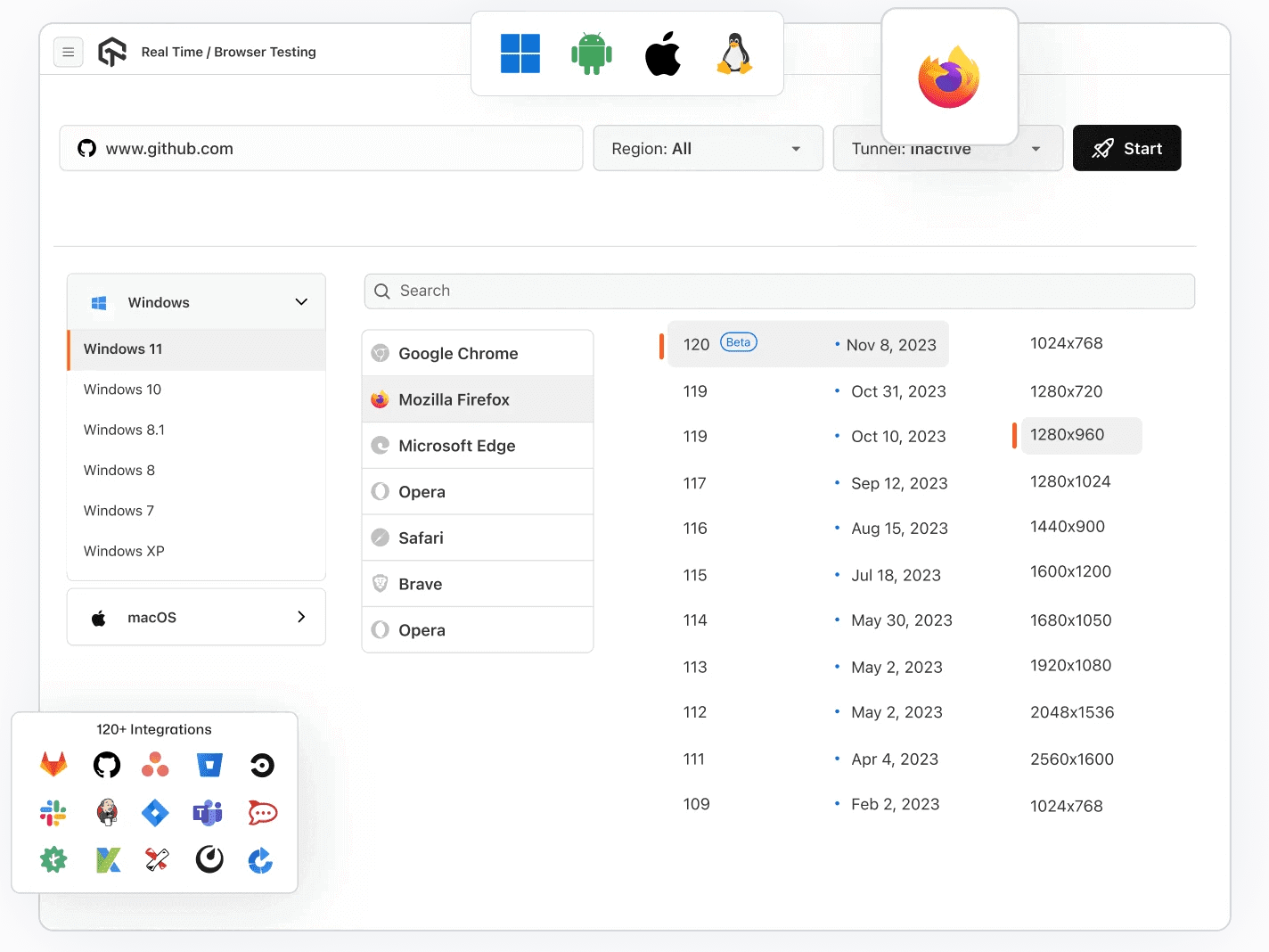 Seamlessly validate your web app or website across all Firefox versions, from Firefox 4 to the latest and even beta releases, with our live interactive testing environment.