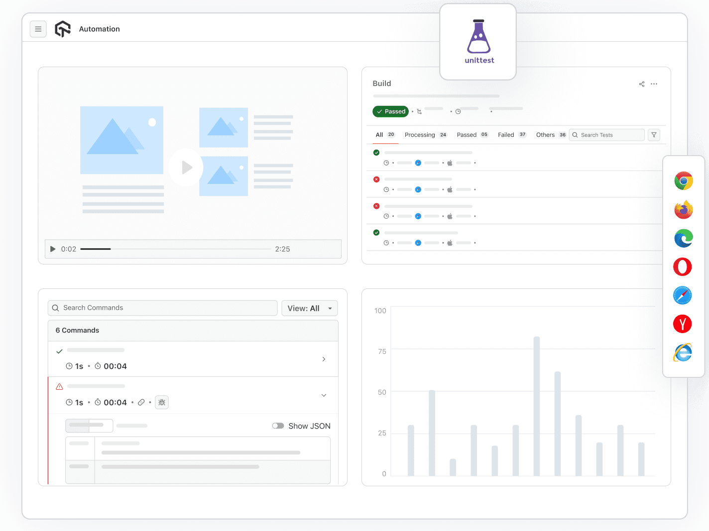 LambdaTest enables swift debugging of application issues with detailed logs for each UnitTest run. Access raw Selenium logs, exception logs, network logs, command logs, and a comprehensive video log from real machines.