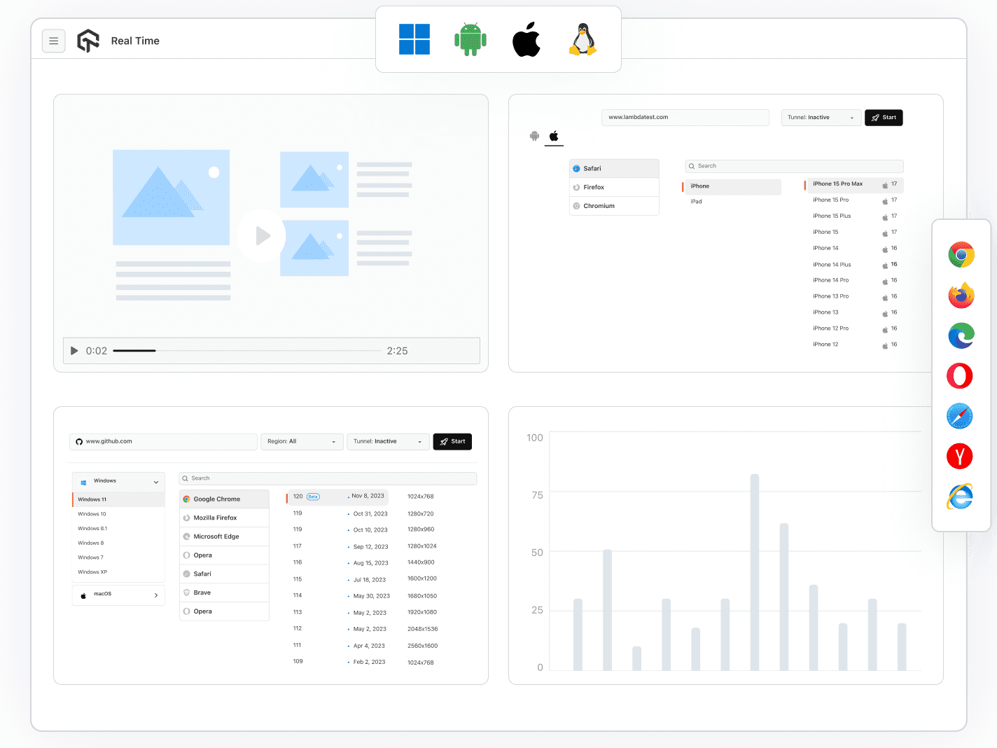 Run interactive tests on over 3000 browser configurations. Select browser type, version, OS, and resolution for thorough compatibility checks.